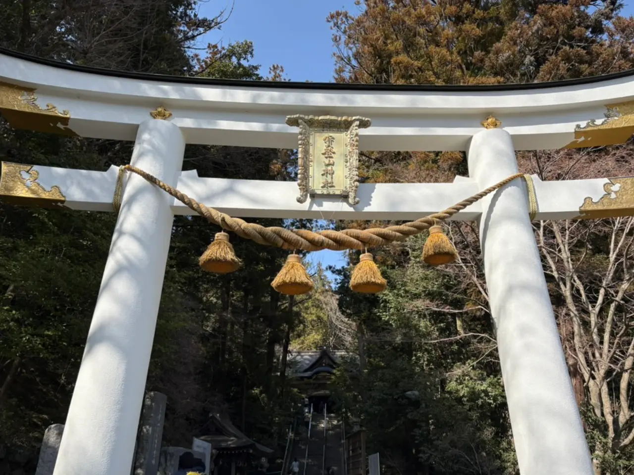 登山終了後に必ず行きたい宝登山神社。下山後にすぐ現れる白い鳥居をくぐります。