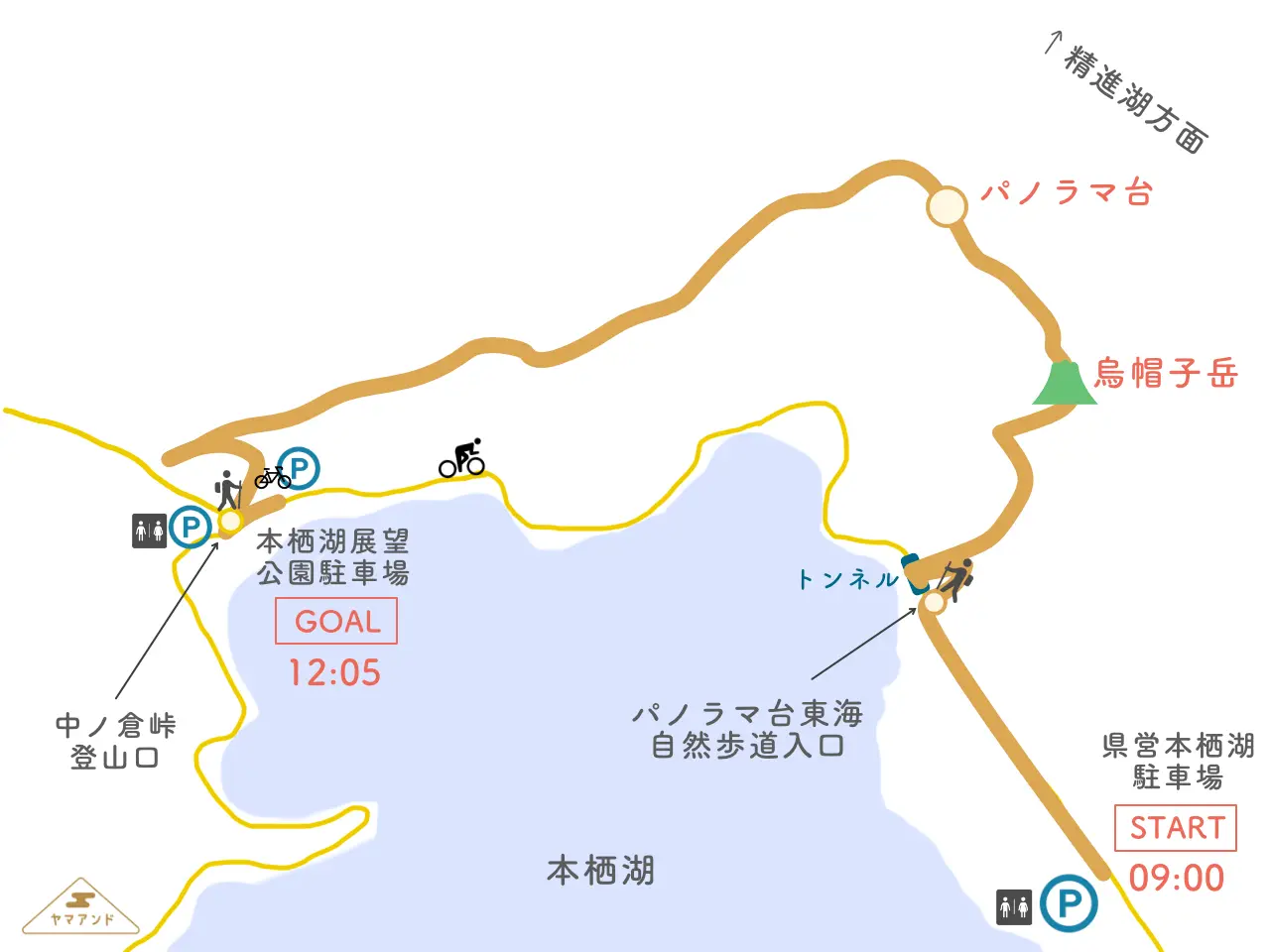 GOAL地点の本栖湖展望公園駐車場に自転車をデポ。そのあと車でSTART地点の県営本栖湖駐車場(無料)へ移動し、そこからハイキングをスタート!