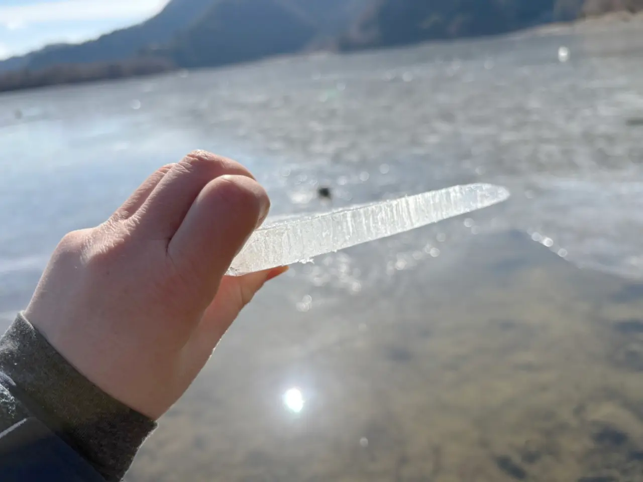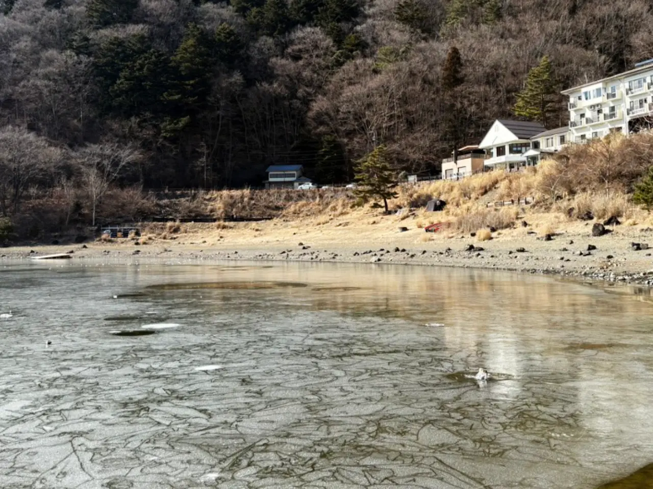 村を後にし、精進湖にも寄ってみました。この日は湖面が1cmくらい凍ってました。